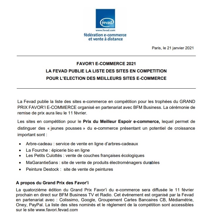 Organisé chaque année par la Fevad en partenariat avec BFM Business,le Grand Prix Favor’i récompense les meilleures initiatives du e-commerce français en matière d’innovation, de qualité de service et d’engagement environnemental.